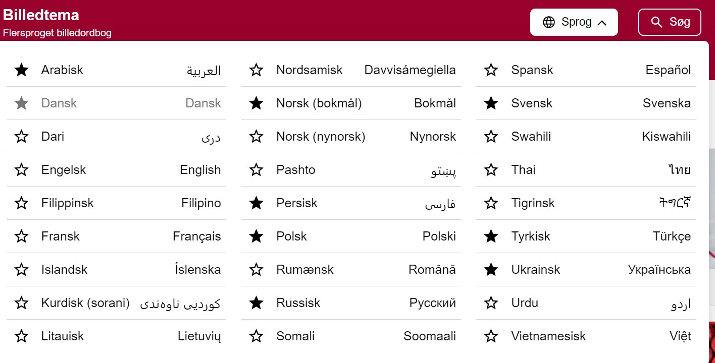 Alle sprog man kan vælge imellem